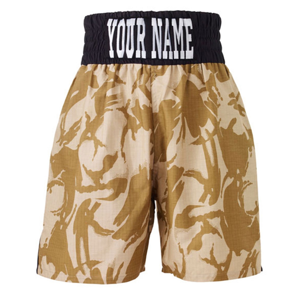Suzi Wong Desert Camouflage boxing shorts with a black satin waistband. Great for any army loving boxer or someone who wants to stand out from the crowd. Working great with any colour embroidery on the shorts or waistband.